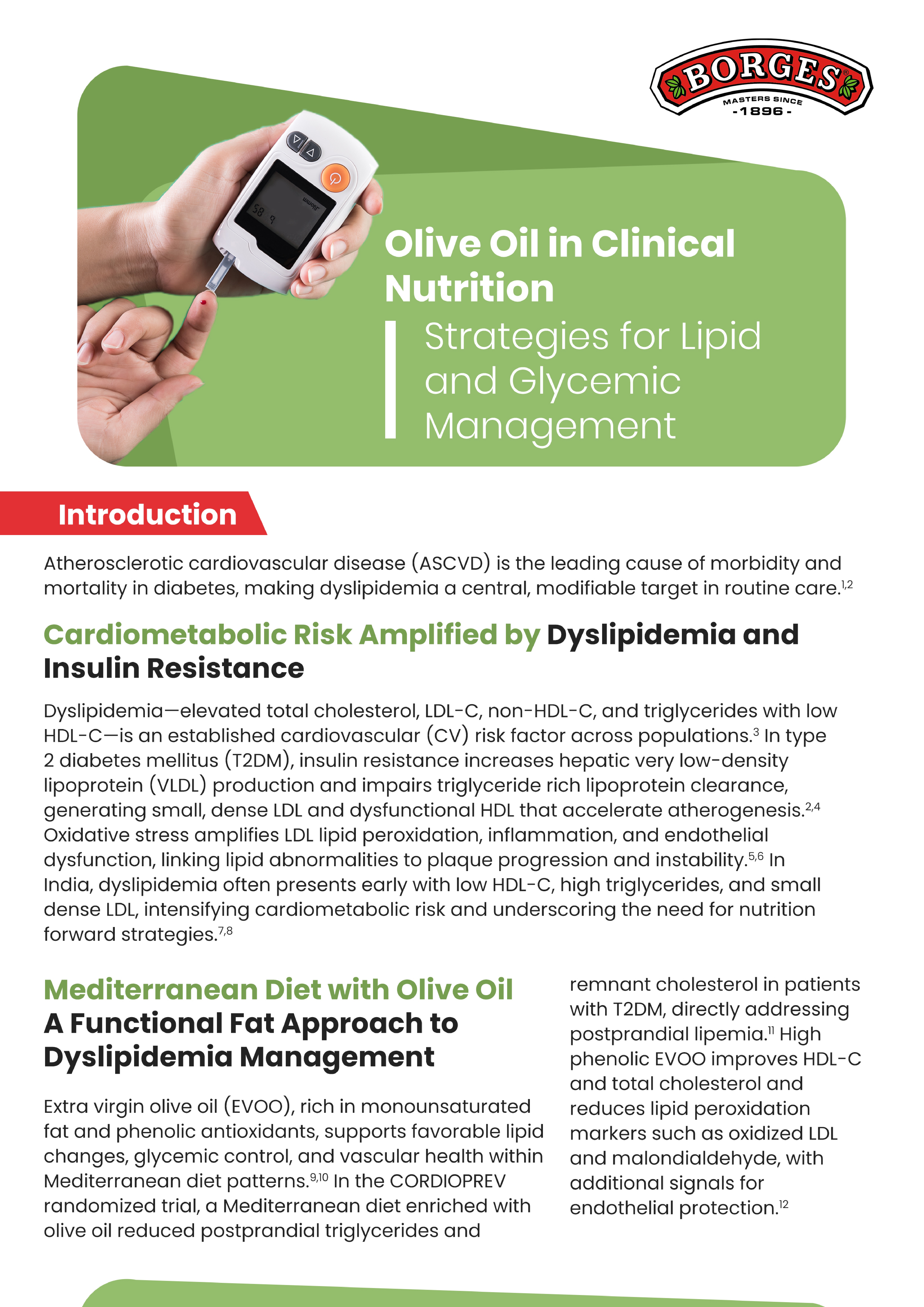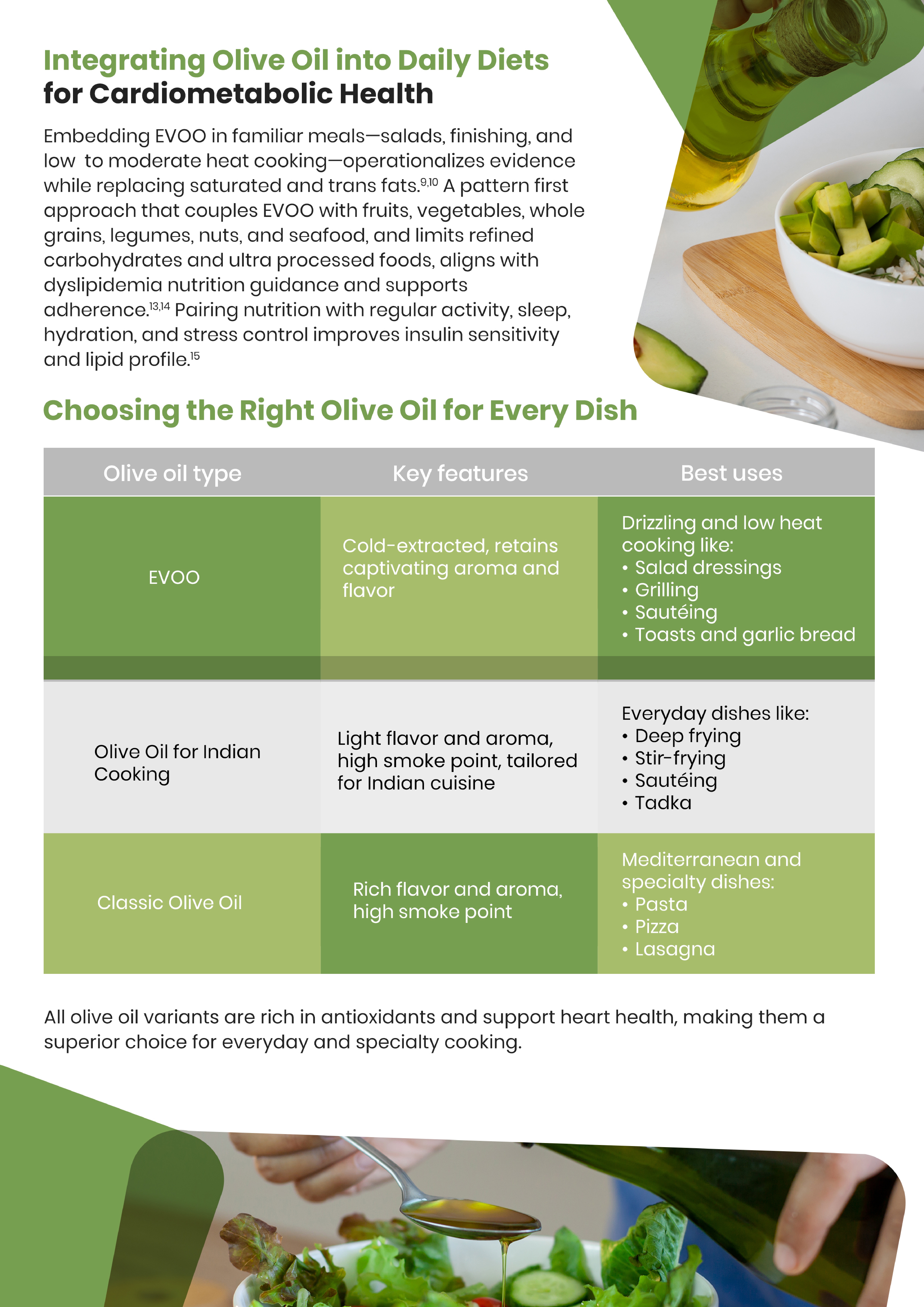 Olive oil is a functional fat that promotes cardiometabolic health by enhancing lipid and glycemic profiles through its MUFA and phenolic compounds, supporting LDL-C, HDL-C, triglycerides, inflammation control, endothelial function, and postprandial lipemia. Extra virgin olive oil, rich in polyphenols, is best for drizzling and low-heat cooking, preserving its antioxidant and metabolic benefits. Olive oil for Indian Cooking features a higher smoke point, making it suitable for deep-frying, stir-frying, and everyday meals. Classic olive oil, with its robust flavor and high smoke point, is ideal for Mediterranean and continental dishes, allowing practical, heart-healthy culinary use._page-0001.jpg)