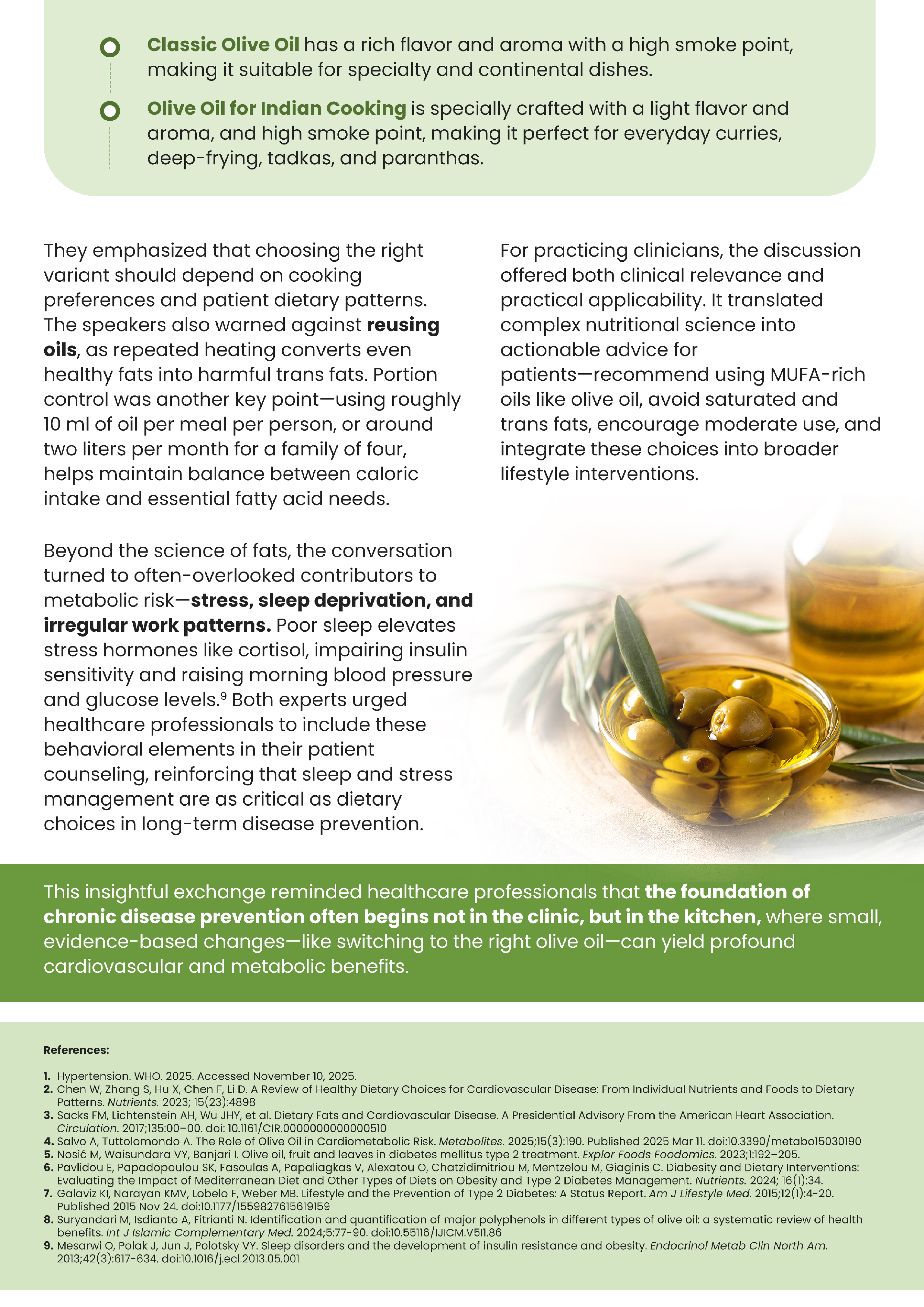 The growing emphasis on preventive nutrition has highlighted the pivotal role of healthy dietary fats, with olive oil standing out as a key ally for vascular and metabolic health. Its rich MUFA and antioxidant profile enhances endothelial function, regulates blood pressure, and supports glycemic balance. When combined with holistic lifestyle measures, olive oil becomes a cornerstone of sustainable cardiometabolic wellness.