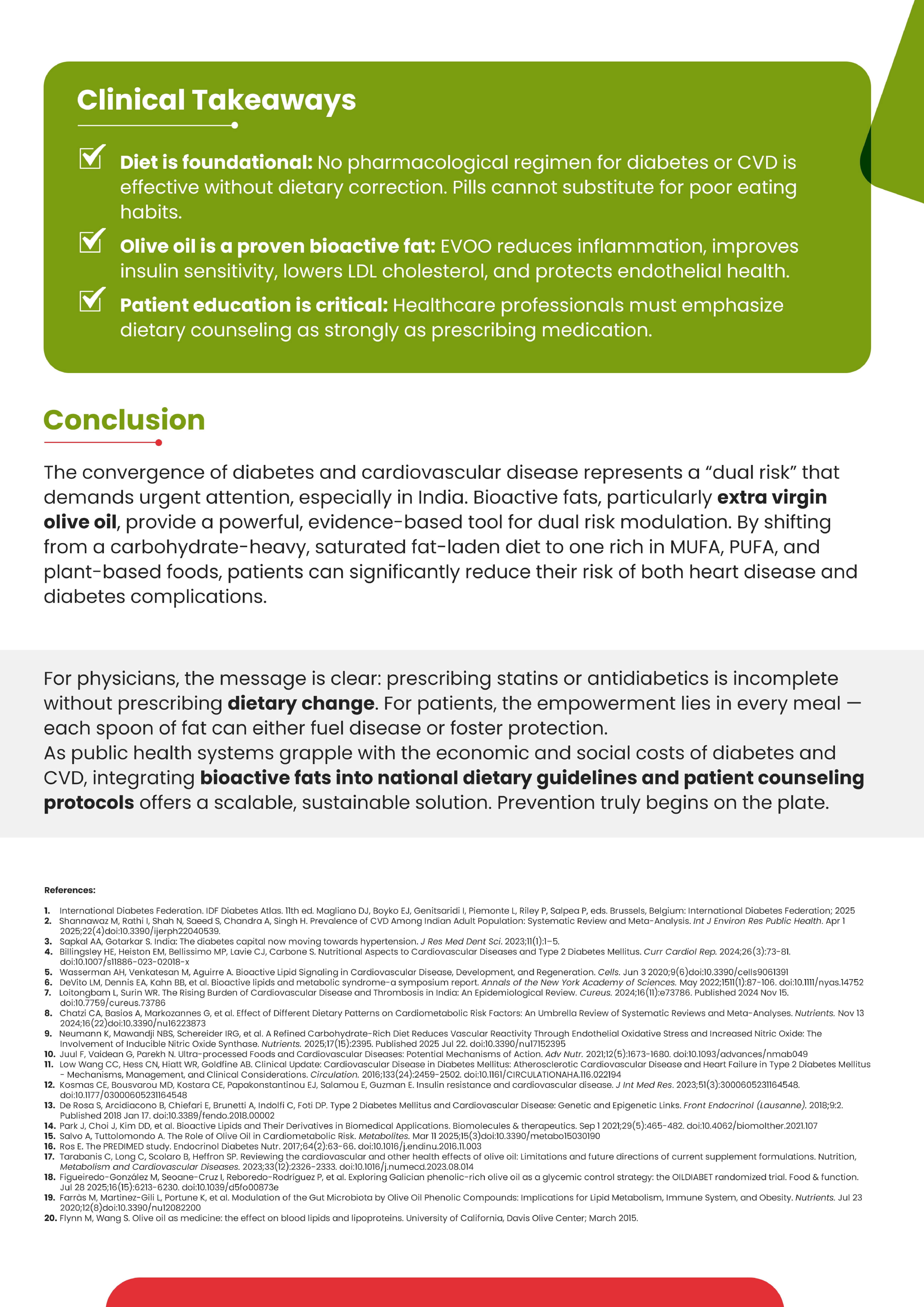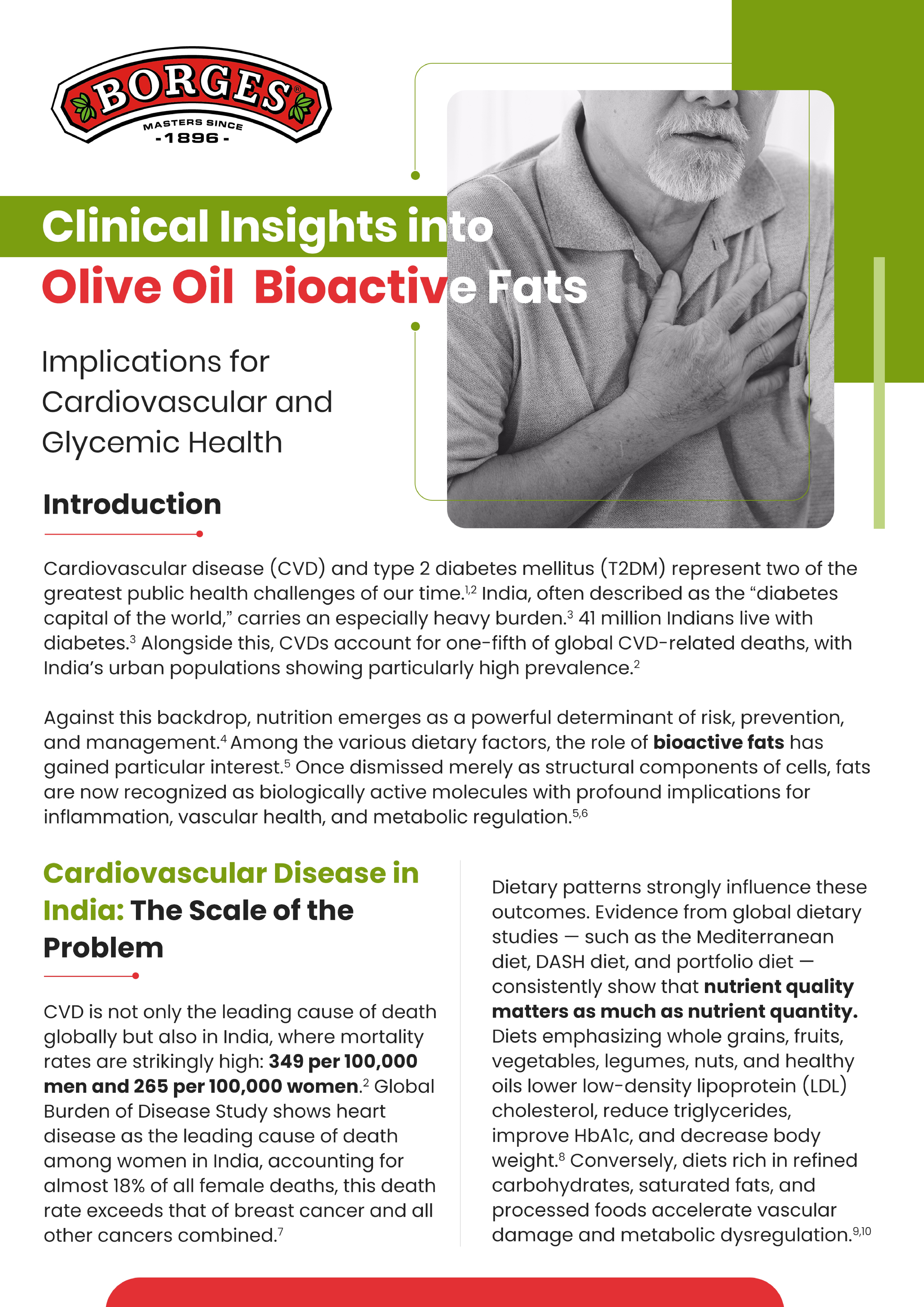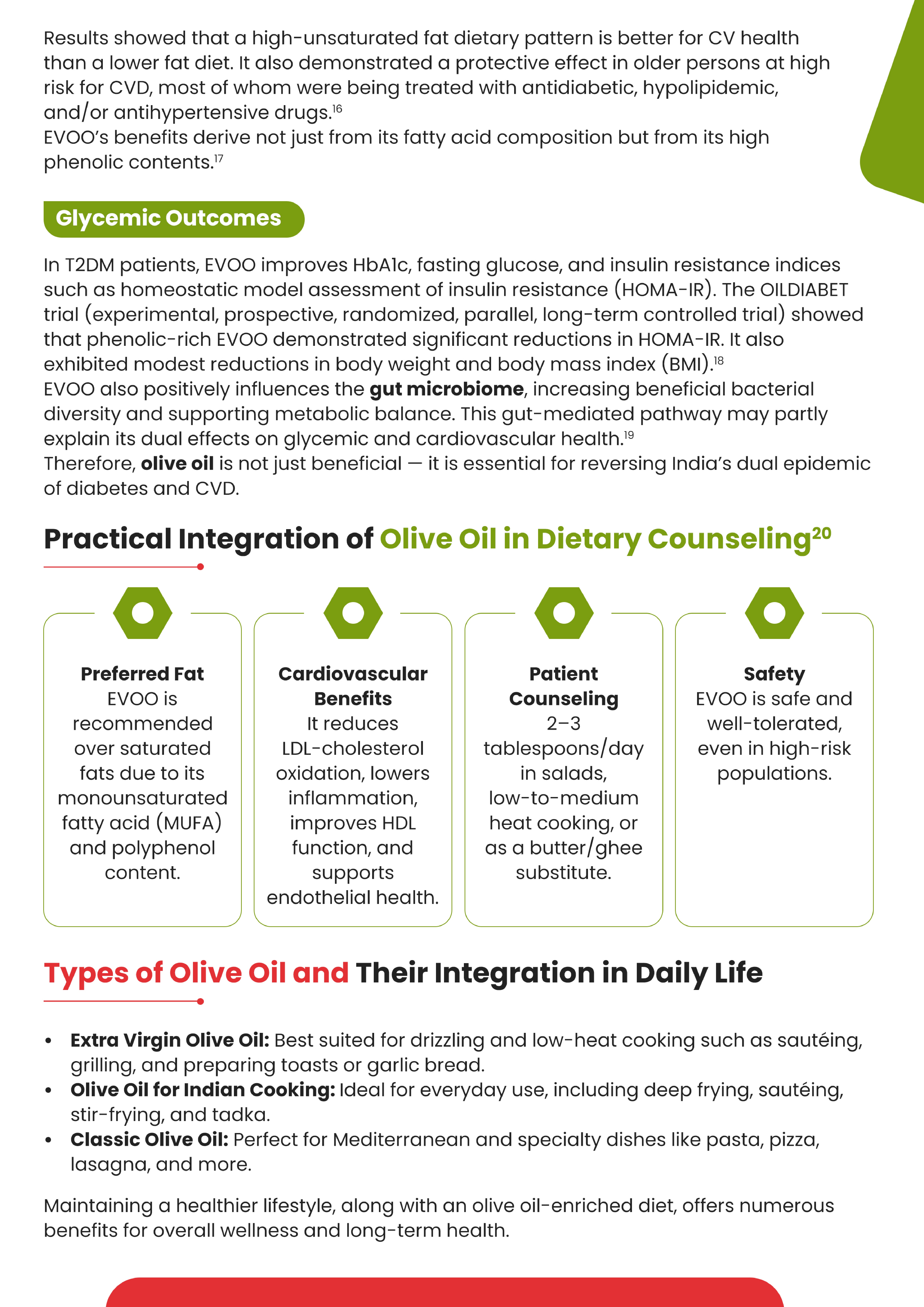 Olive oil supports cardiovascular and glycemic health by reducing LDL oxidation, lowering inflammation, improving insulin sensitivity, and enhancing endothelial function. Three types cater to different culinary needs while preserving health benefits: extra virgin olive oil is ideal for drizzling and low-heat cooking, olive oil for Indian cooking is suitable for high-heat applications, and classic olive oil is the best for Mediterranean and specialty dishes, maintaining flavor and stability. In clinical trials, olive oil demonstrated improvements in lipid profiles, HbA1c, and HOMA-IR, highlighting its role in dual risk reduction for cardiovascular disease and type 2 diabetes._page-0001.jpg)